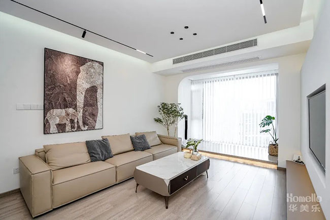 既然是簡約主題,軟裝的選取自然也遵循這一邏輯,米白的沙發搭配巖板茶幾算是標配設定,茶幾方面,外觀是簡約的線條,內在是不俗的收納空間,耐看實用。沙發背景墻裝上掛畫為環境增添一寫藝術元素,提升格調。