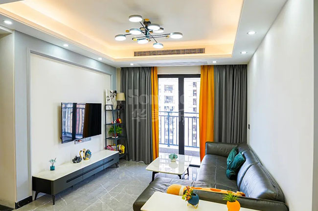 客廳是以灰白經典配色為主的簡約空間,天花做了邊頂設計,打造了中央空調來優化的空間布局與提升生活體驗。電視背景墻的主體沿用了原始結構乳膠漆墻,邊沿加上了淺灰色包邊設計來塑造一點層次感。