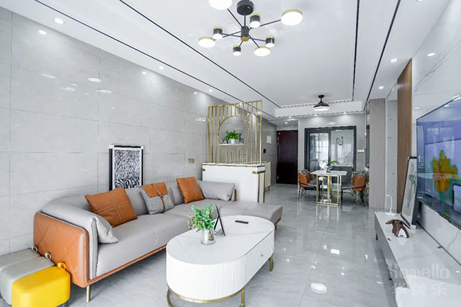 客廳主打灰白色調(diào)的簡約主題,空間內(nèi)每處都有著細(xì)節(jié)的體現(xiàn)。地板和墻體都通鋪了淺灰大理石瓷磚,一來能為客廳提亮,二來更貼合生活需求,南方城市的家庭都不可避免有面對潮濕的日子,相對乳膠漆來說,瓷磚墻清潔起來更為簡單輕松。