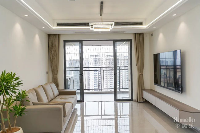 戶型是極簡風主題整裝,色調以淺灰和米白為主,天花只做簡單的邊頂,以其簡潔明快的線條展現了都市生活的現代感和舒適性,營造出一種輕松、自然的居家環境。
