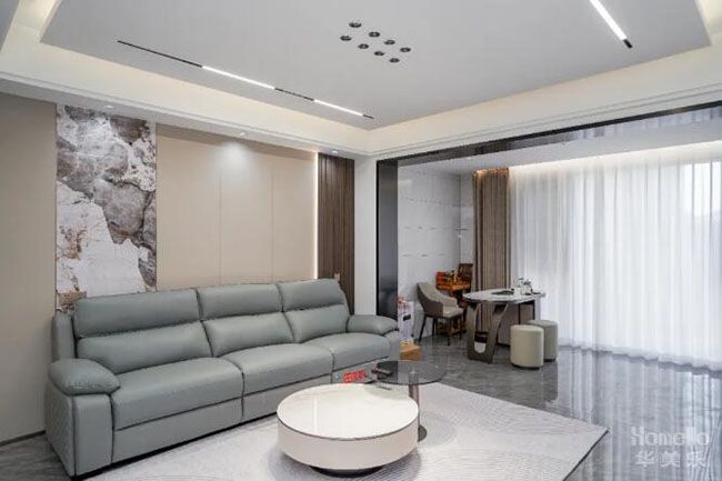 客廳以白色、淺灰和木質色調為主地面鋪設灰色調瓷磚,與簡約風格相得益彰。窗簾則選用透明薄紗和遮光布兩種材質,可以根據需要調整采光和隱私。天花采用無主燈設計來提升空間感,LED燈帶和隱藏光源提供了均勻的照明,營造溫馨舒適氛圍。