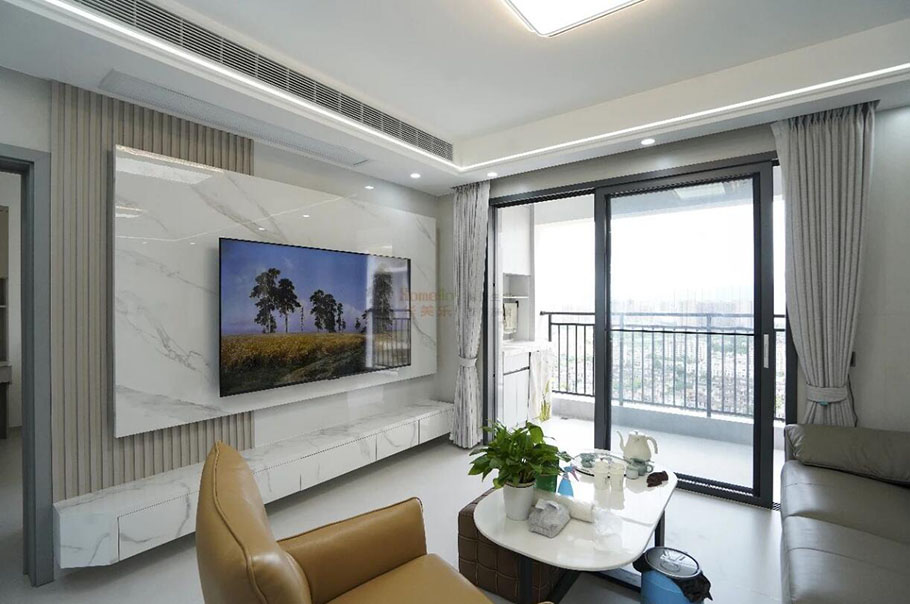 電視背景墻采用大理石材質,表面光滑且帶有自然紋理,顯得非常高檔。背景墻的設計簡潔,沒有過多的裝飾,突出了電視的存在感。背景墻兩側有豎條紋的裝飾板,增加空間層次感和視覺延伸效果。電視下方有一個懸空的大理石電視柜,既美觀又實用,提供了儲物空間。