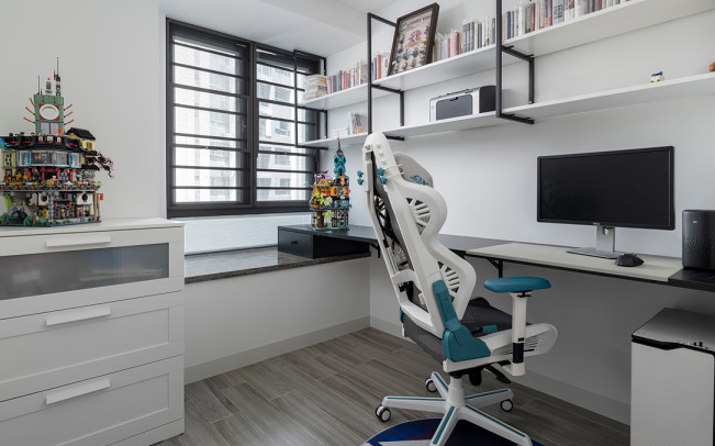 書房承載的不僅是兩人的辦公功能,更多的是興趣和愛好,書架為開放式吊架,上面一層碼得整整齊齊的是女主人的閑時讀物,房間還放著兩座樂高,都是小兩口的共同愛好。旁邊的儲物柜,透明磨砂的柜面讓大面積的白色得到了緩和。書桌利用窗臺墊高,減少了桌角的累贅,干凈利落,避免衛生死角。