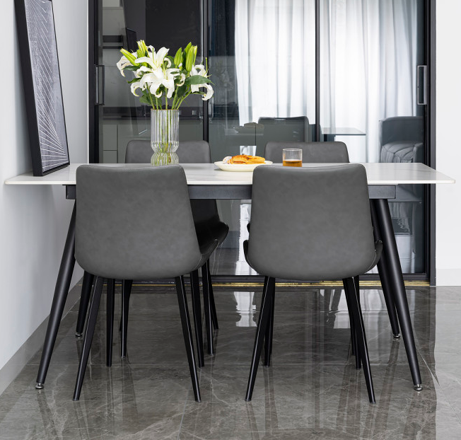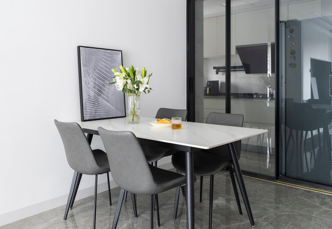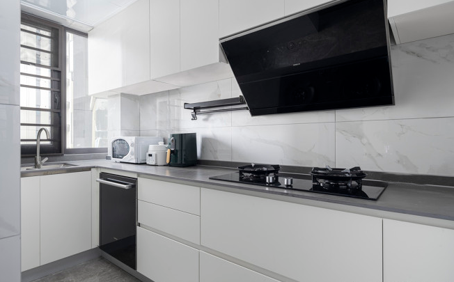 廚房以黑白色調為主,墻面用的是魚肚白墻磚,櫥柜吊柜和地柜均用的白色亞光烤漆,地板則延用與客廳一致的灰色大理石瓷磚。灰色巖板的操作臺耐臟,在尺寸設計上沒有做下扣邊,讓巖板臺面更加精致地柜的設計上盡可能多的使用大件抽屜,使用更加方便。