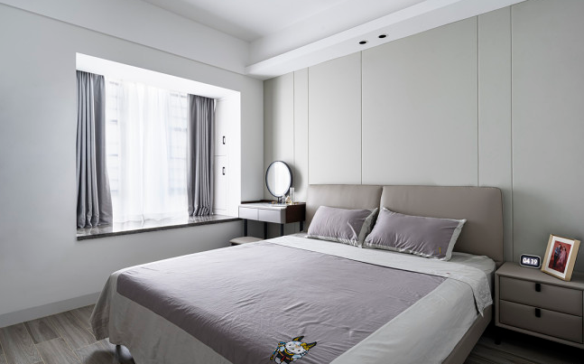 不同于客廳的沉穩,主臥的色調偏柔和,布簾顏色與床單相近,灰紫色的點綴令飽和度較低的臥室“回暖”,更溫馨柔和,木地板也比地板磚多了幾分暖意,更適合休息。硬包床頭背景墻與皮質床頭和床頭柜相襯,頂上是內嵌筒燈,實現局部照明。