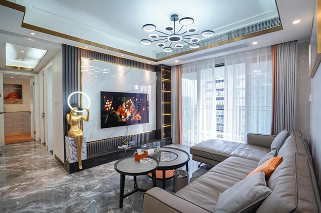 客廳吊燈天花進行金屬包邊,將層次感與輕奢感結合,裝上中央空調能節省空間占用,同時保留了整體的線條美。不與餐廳設置隔斷,整個空間能顯得更加通透明亮。