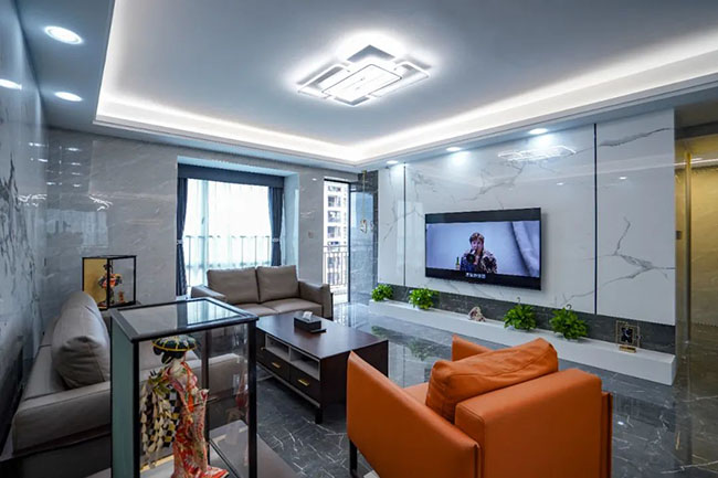 電視背景墻由巖板云紋大板磚砌成,與沙發背景墻水墨畫相互映襯,讓客廳成為了一幅美好的畫卷。電視線路提前做了線路預埋處理,讓電視背景墻看來更加干凈。