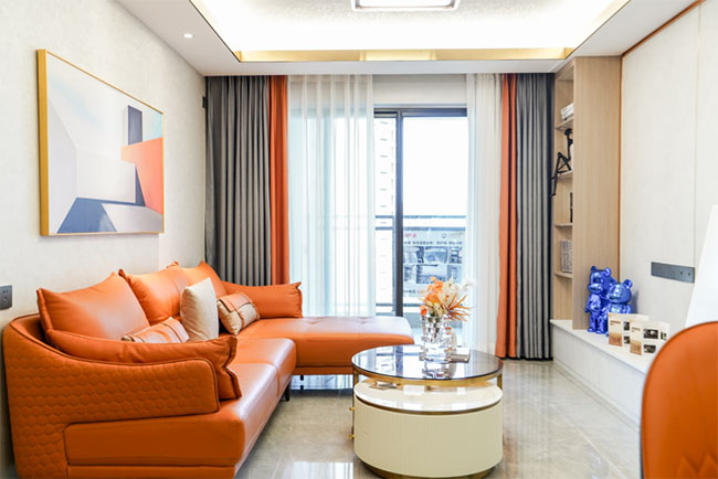 客廳設計主題是輕奢風,配色以年輕人鐘愛的愛馬仕橙為主,金色、淺灰和原木色作為點綴,色調的冷暖交替十分的和諧。